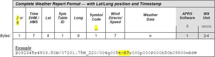 The APRS protocol reference specifies the weather reports. There are different possibilities (raw, positionless, complete with or without timestamp, ...)